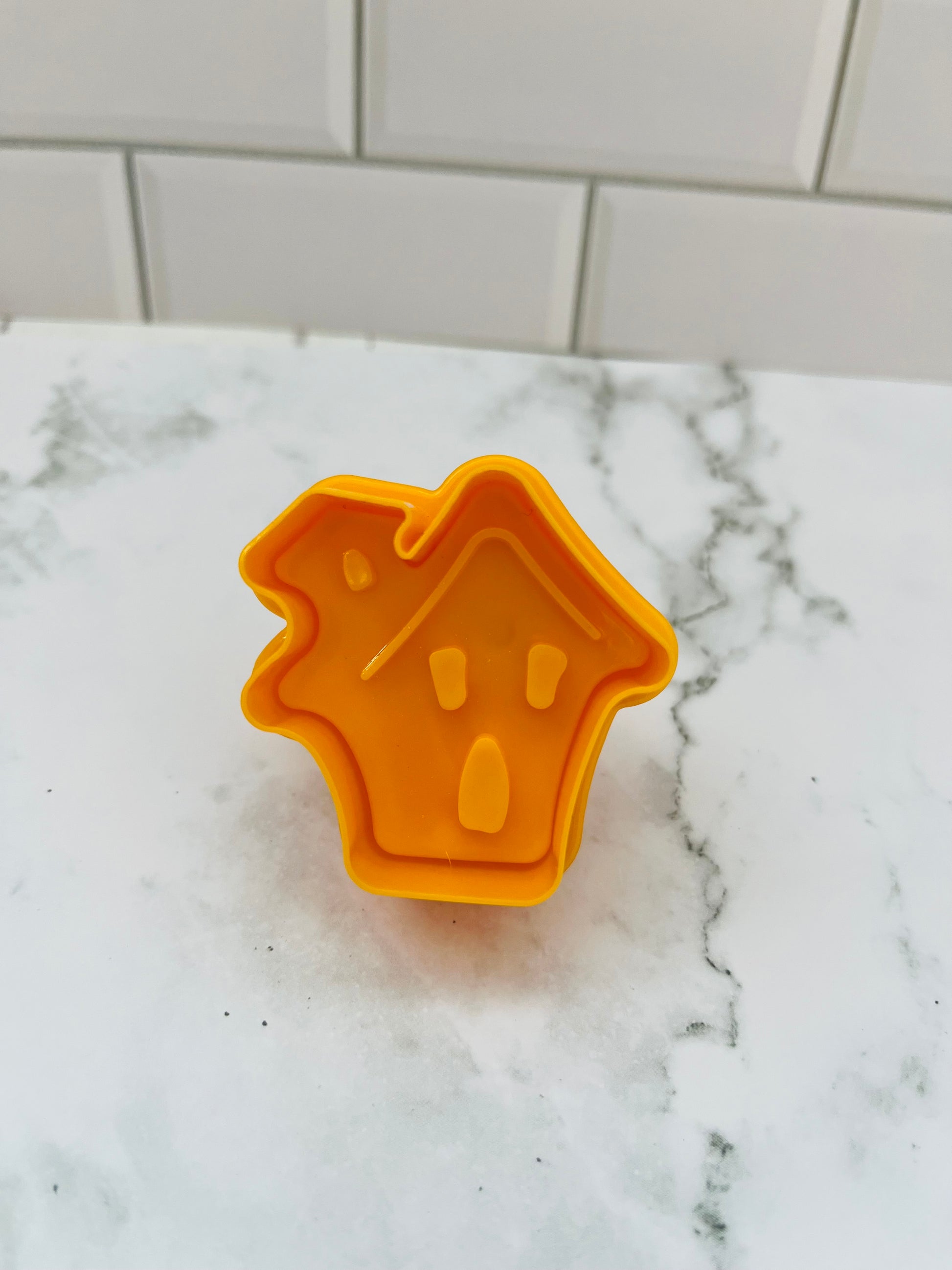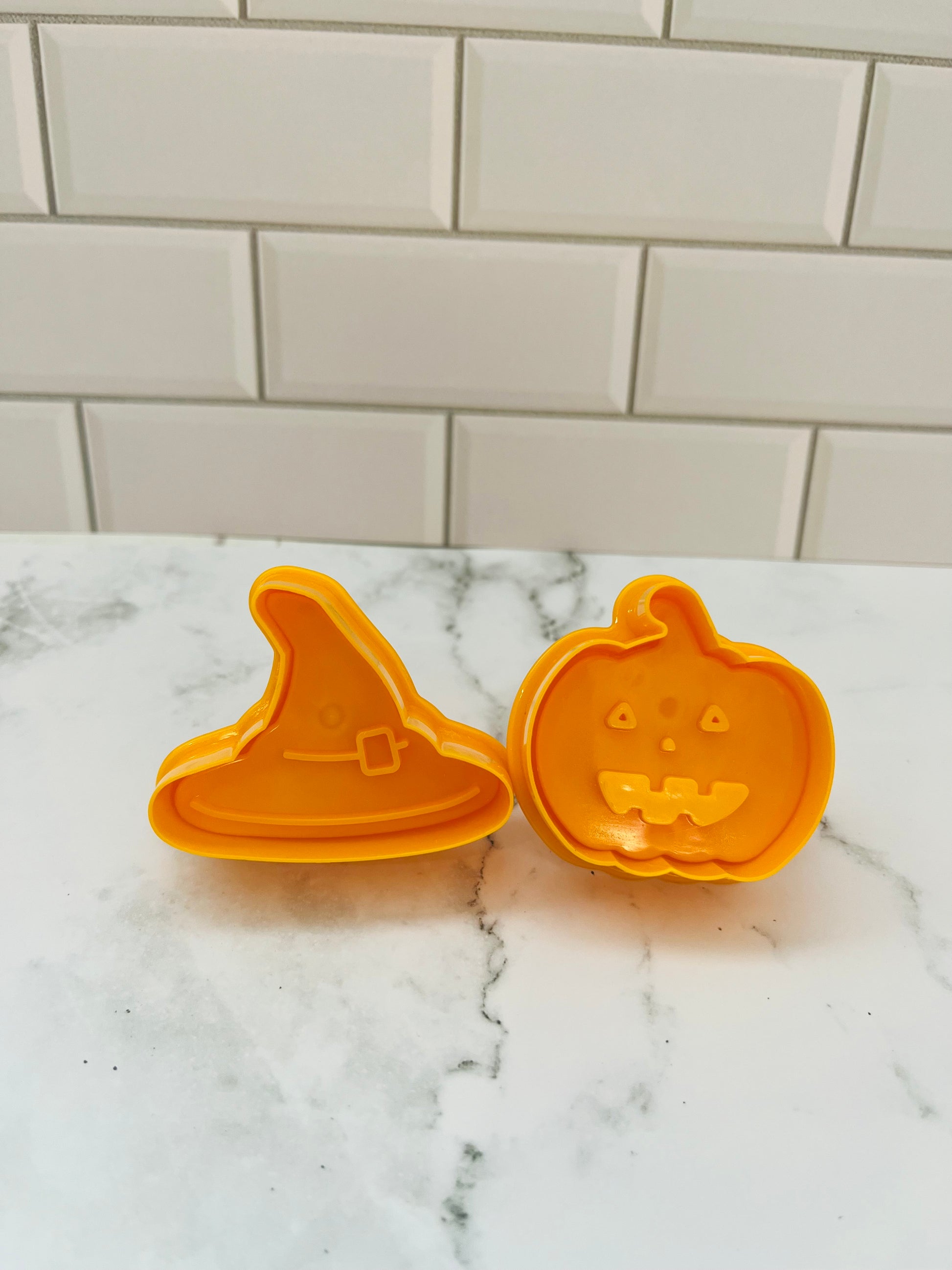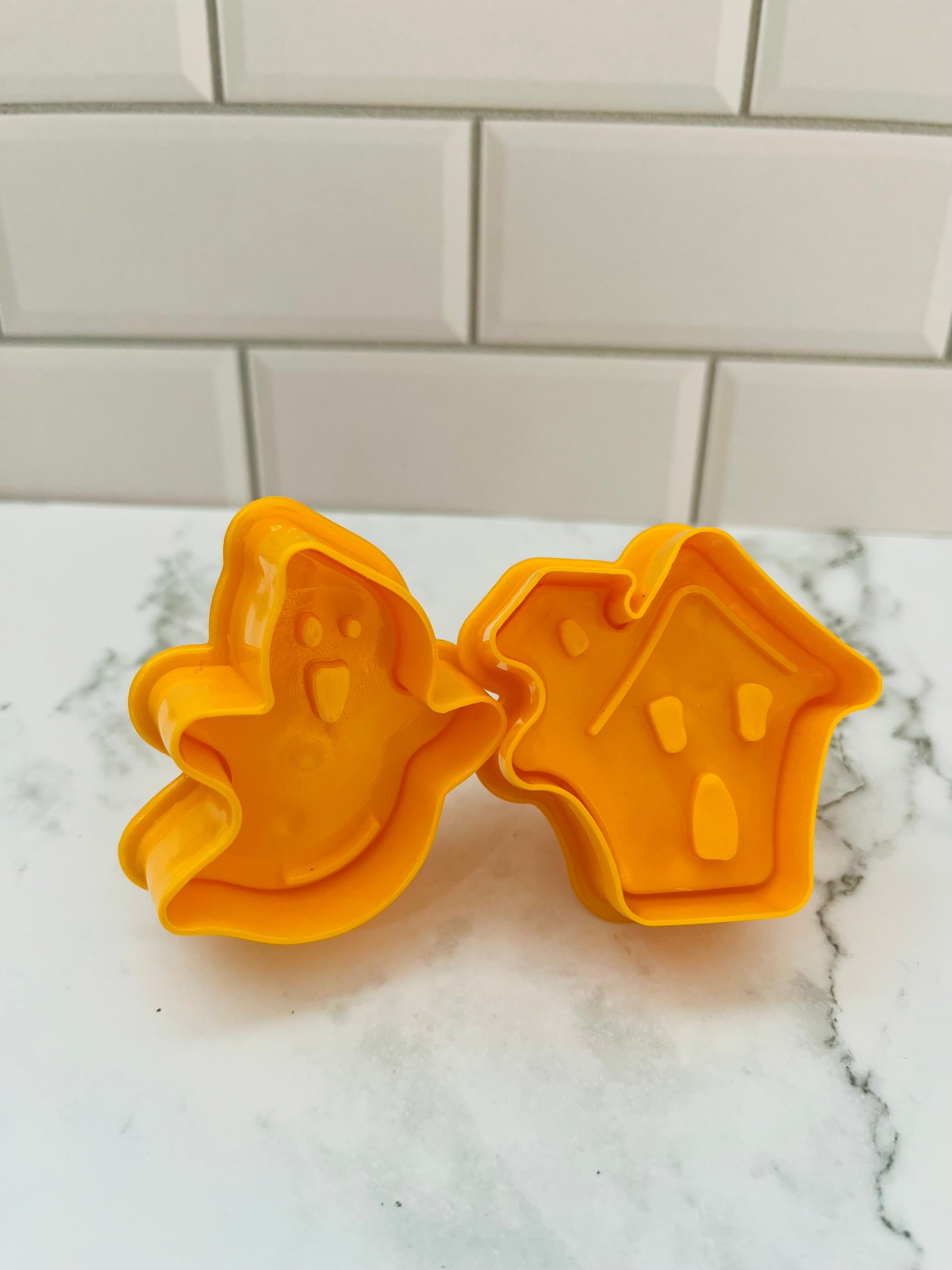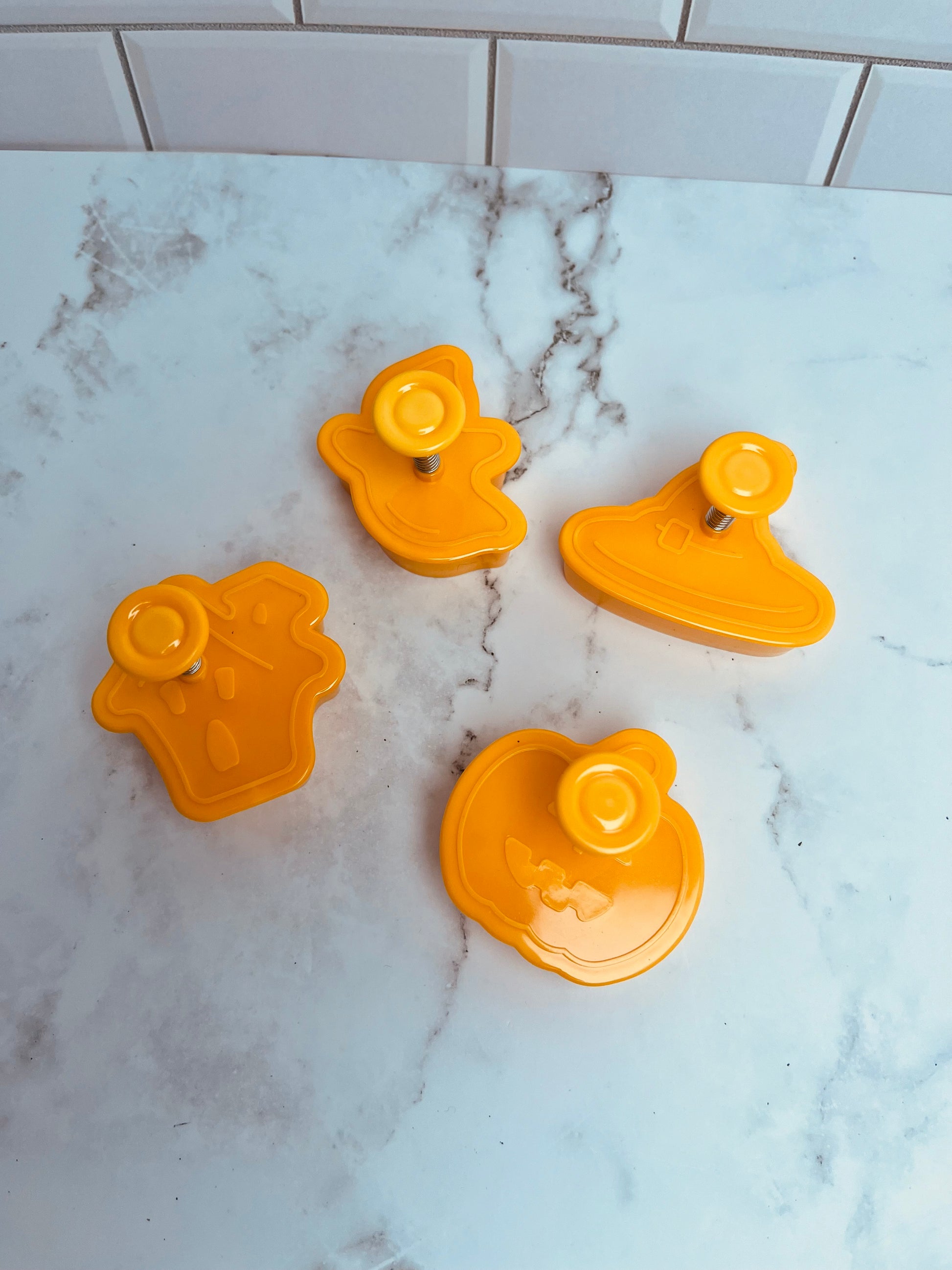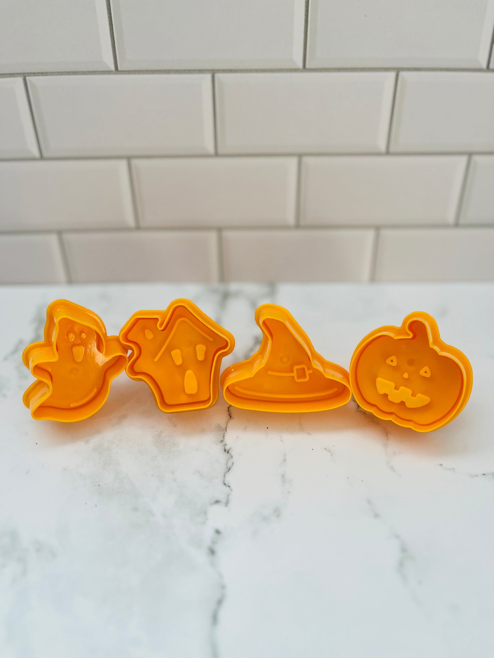 Set de 4 piezas de Cortadores de galletas con botón de resorte para un fácil marcado de las formas en la masa. Puedes involucrar a tú peque preparando bocados divertidos con estos cortadores e incluso preparar unas deliciosas galletas para "dulce o truco.
