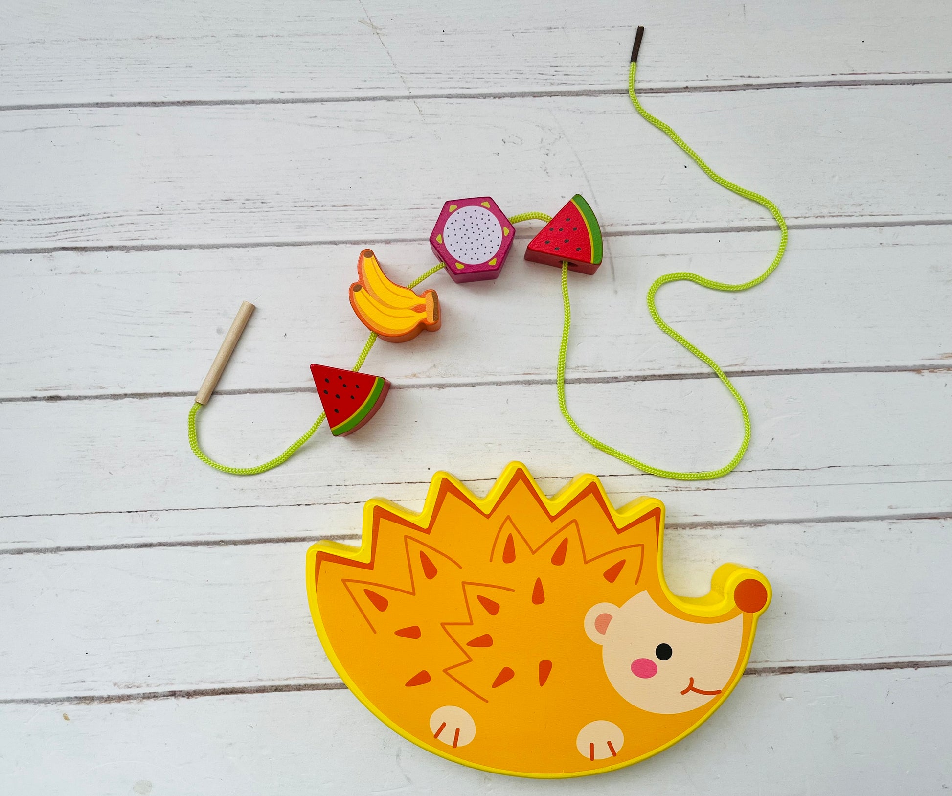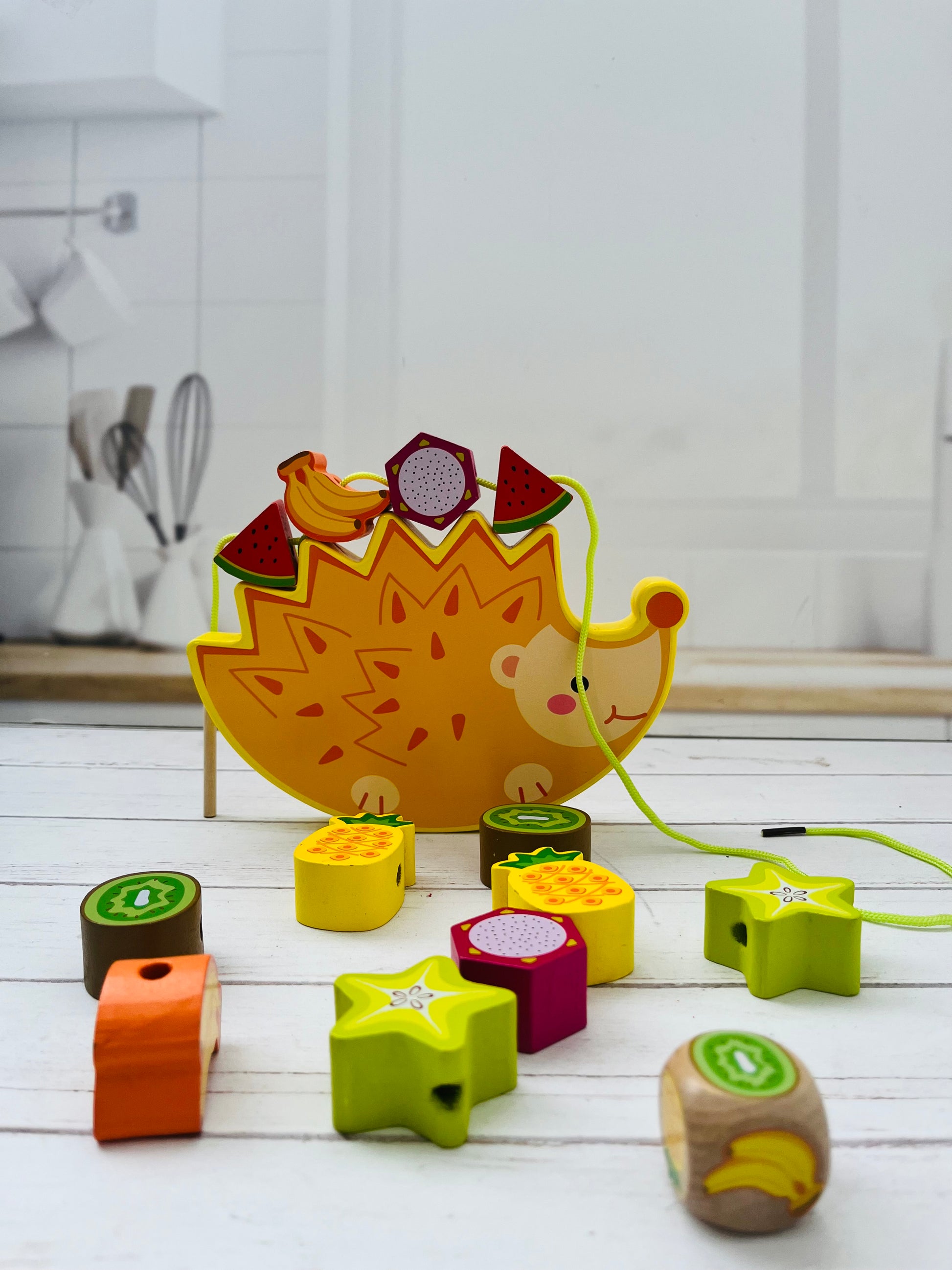 - Frutas de Madera y Cordón de Tejer: Incluye una variedad de frutas de madera de colores vibrantes y un cordón resistente para tejer. Los niños pueden ensartar las frutas en el cordón y luego colocarlas en las espinas del erizo, desarrollando habilidades de coordinación y precisión.