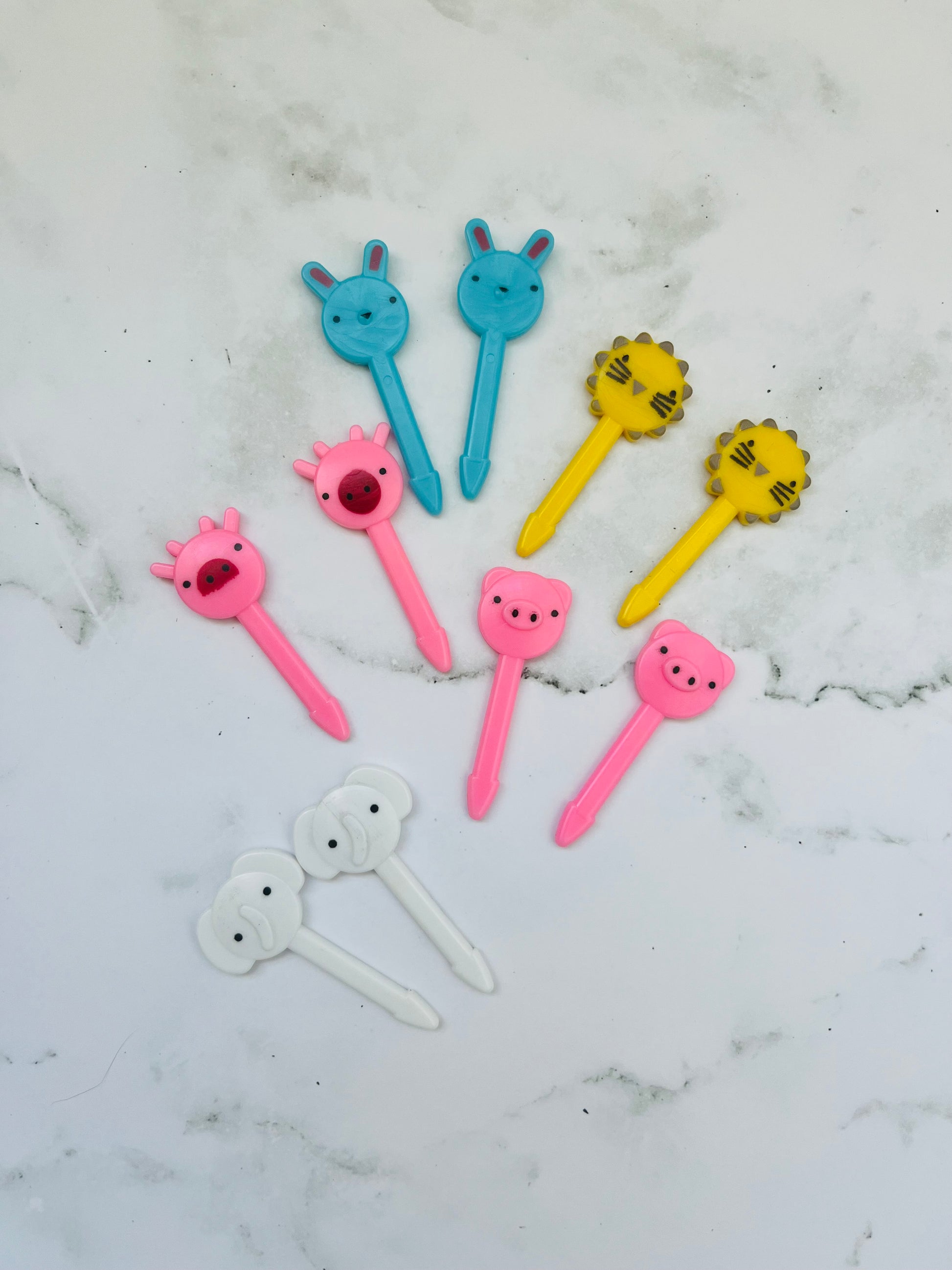 Juego de 10 picks con formas de animalitos, ideales para adornar los platillos de los niños.