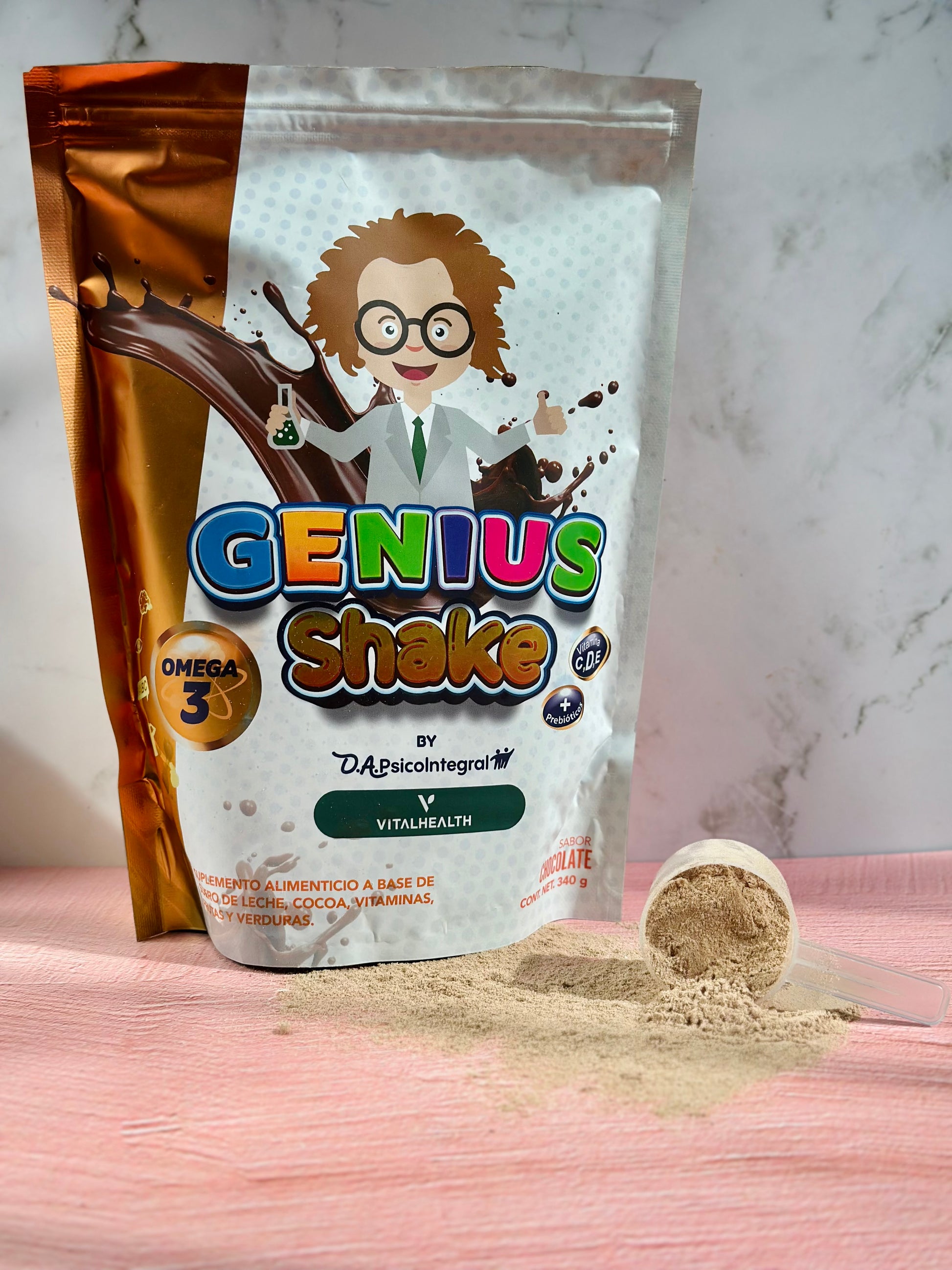 Cada sorbo de GENIUS SHAKE está cargado con NUTRIENTES ESENCIALES para la ETAPA INFANTIL que ayudarán a complementar la alimentación saludable de los niños, promoviendo un sano desarrollo cognitivo y neurológico, crecimiento saludable, un sistema inmunológico fuerte, y una digestión y óptima Con Genius Shake, no solo estarás dando a tus hijos un delicioso sabor, sino también un impulso de nutrientes que los ayudarán a crecer fuertes, sanos y sacando su máximo potencial. Su delicioso sabor chocolate lo hace irresistible además es ¡LIBRE DE AZÚCAR!