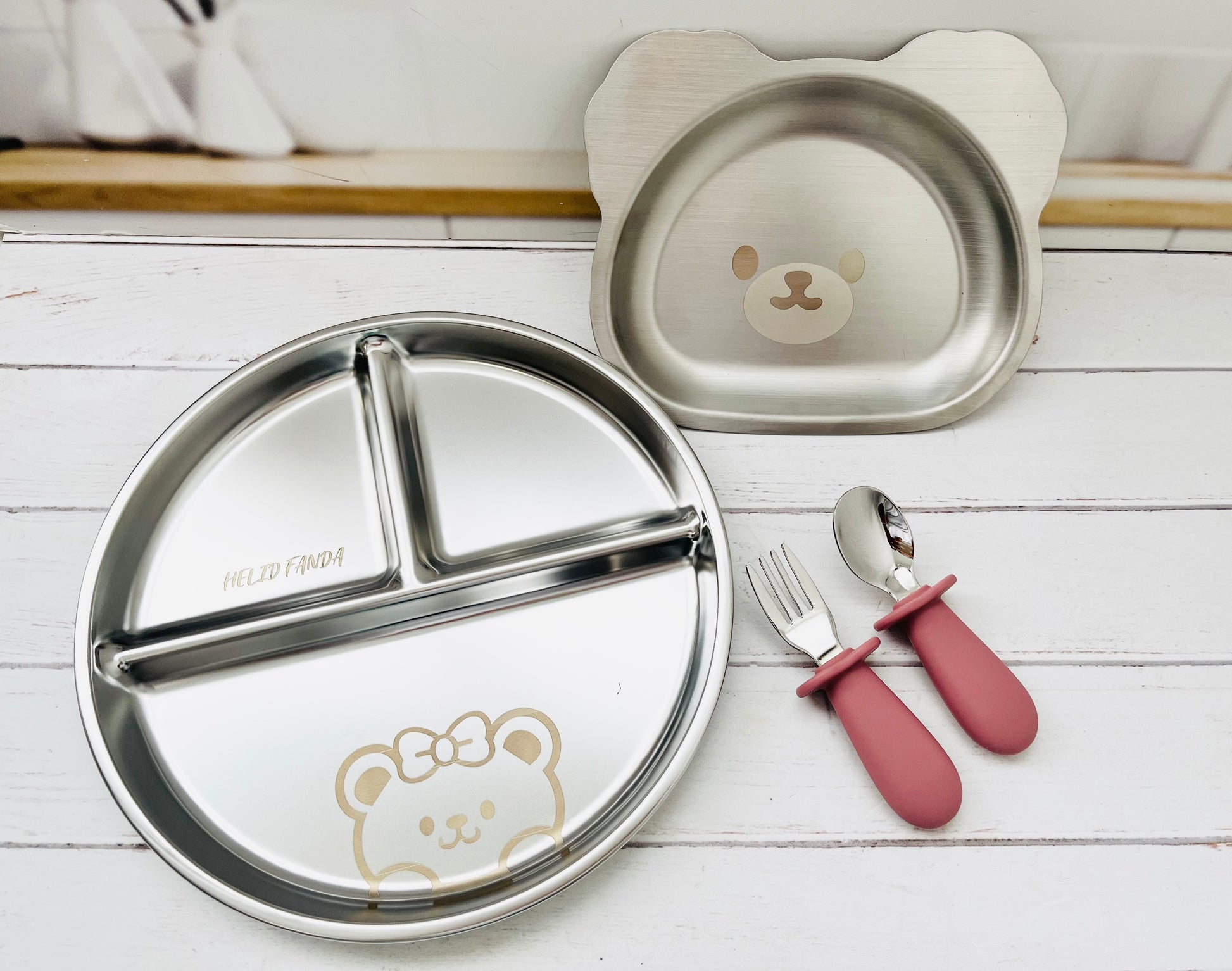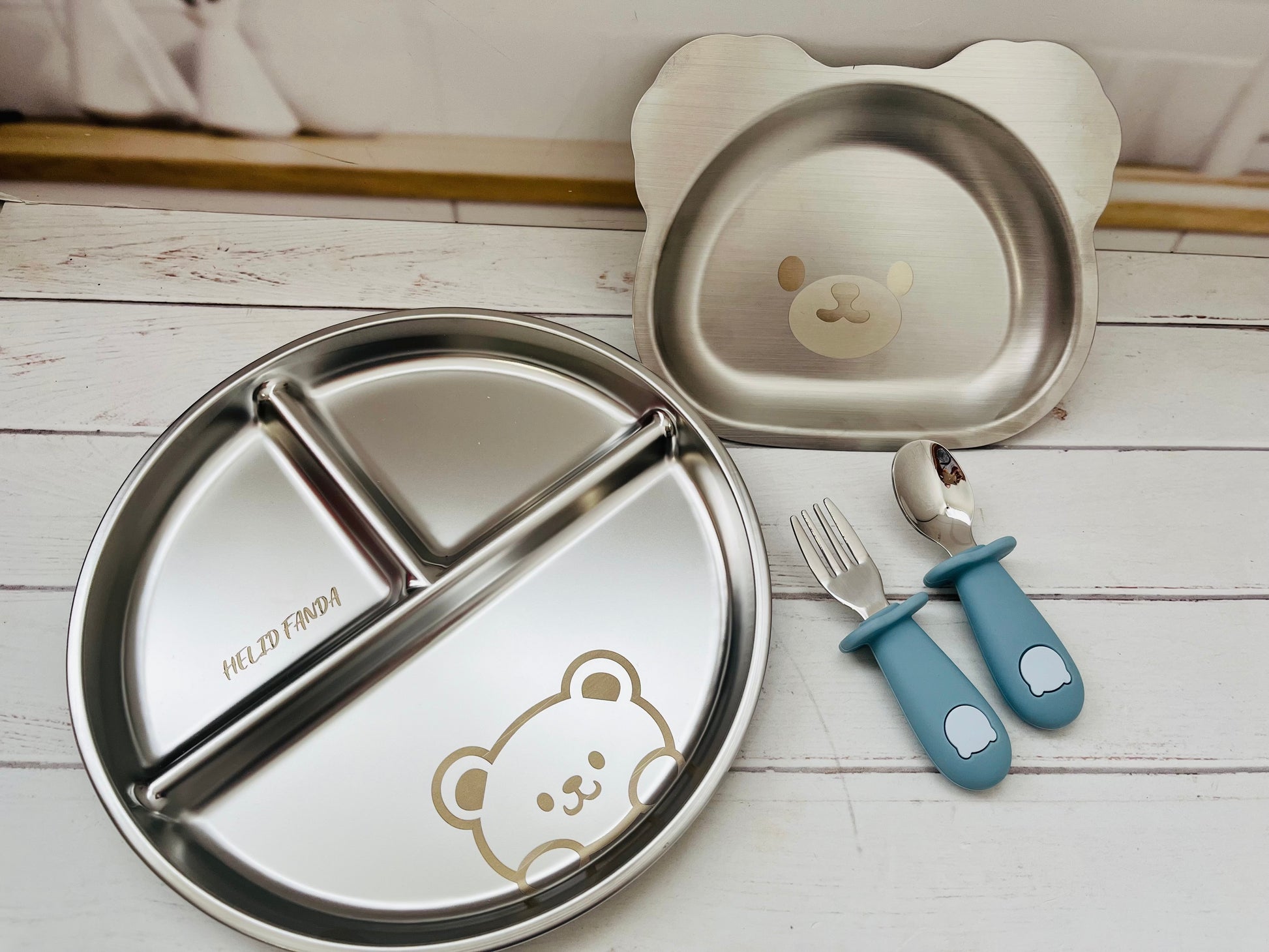 - Cubiertos: Mango ergonómico con tope para un mejor agarre, cuchara semi plana, tenedor puntas redondeadas para no lastimar encías. Material mango de silicona libre de BPA y metal de acero inoxidable.