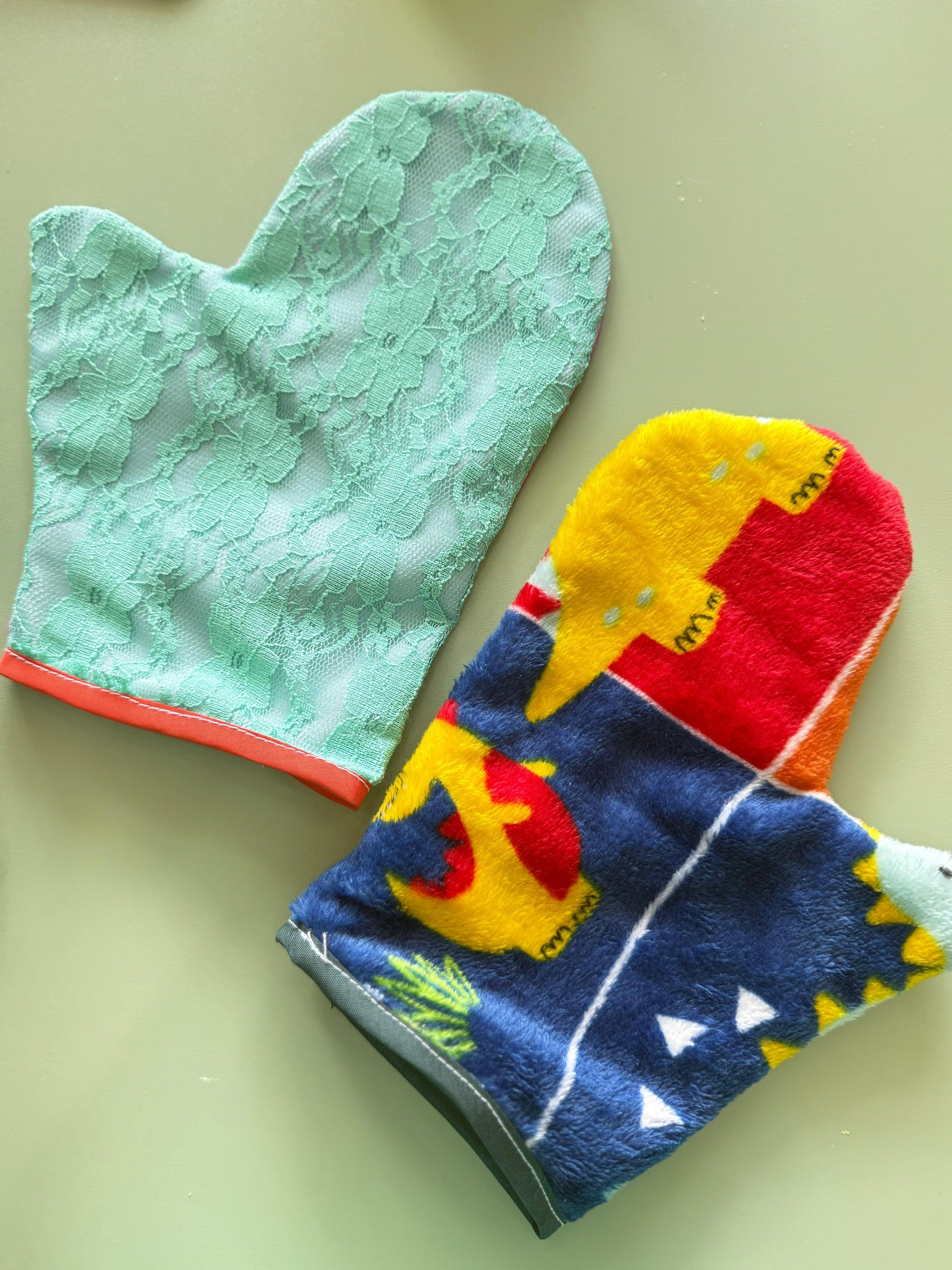 🧤 2 guantes sensoriales doble vista con 4 texturas diferentes.