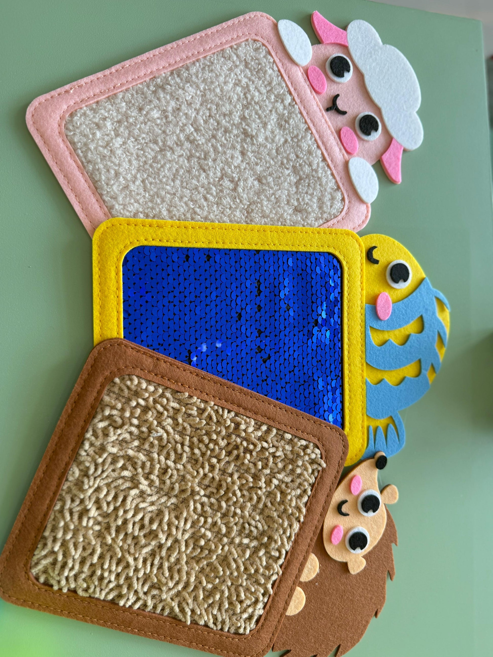 🧩 3 tapetes sensoriales con diferentes texturas y adorables animaciones de animalitos.