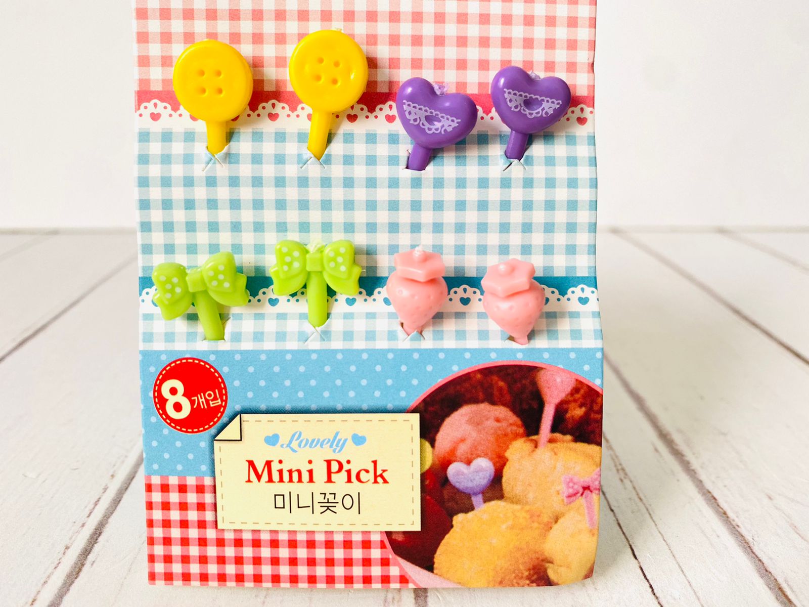 Juego de 6 picks tiernos con figuras de botón, fresas, corazón y moños, ideal para que los peques coman fruta, verduras o pequeños bocaditos