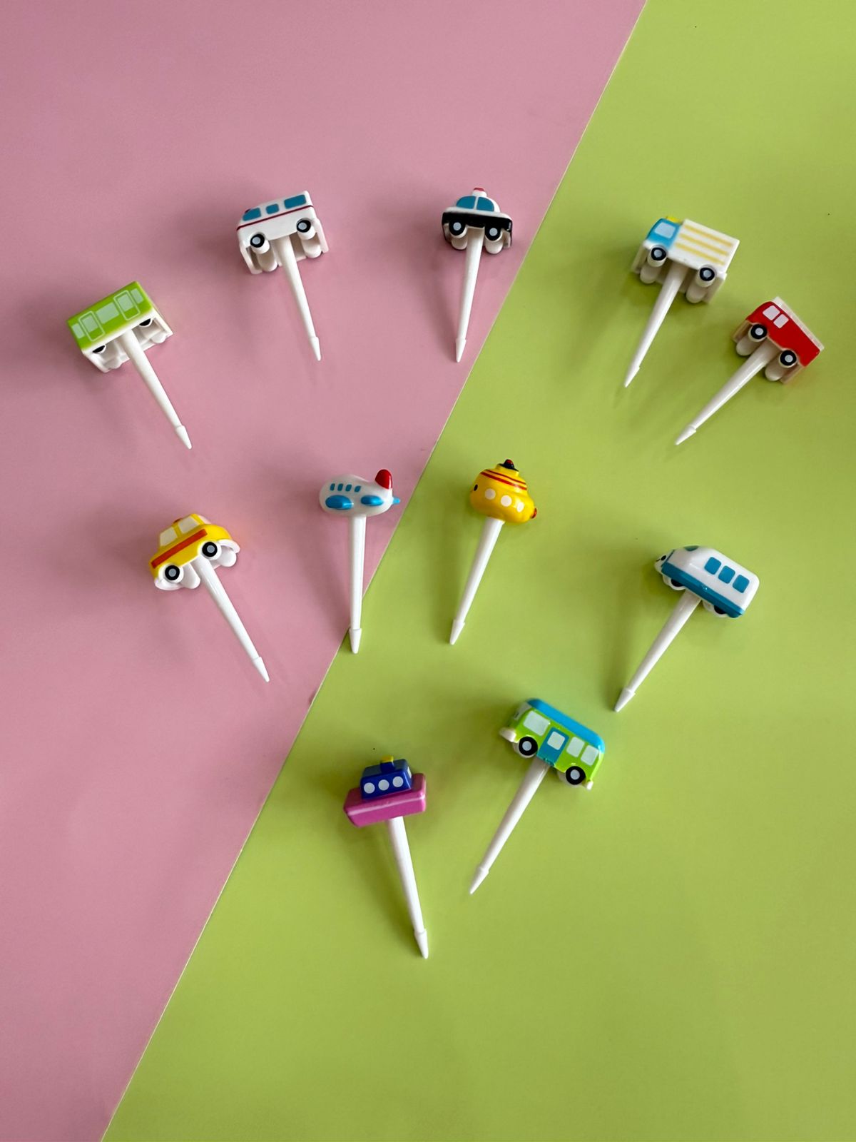 Juego de 11 medios de transporte y sus amigos, ideal para que los peques coman fruta, verduras o pequeños bocaditos