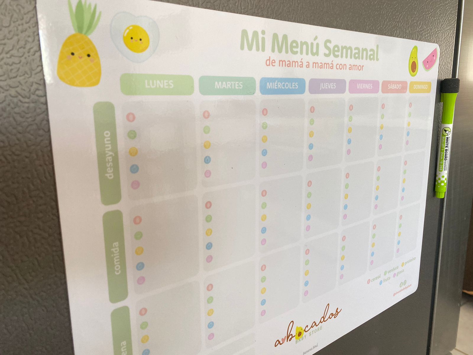Planeador de menú semanal magnético para refrigerador. Ideal para colocar en el refrigerador y ayudarte a organizar las comidas de tu peque, considerando los 5 grupos de alimentos.
