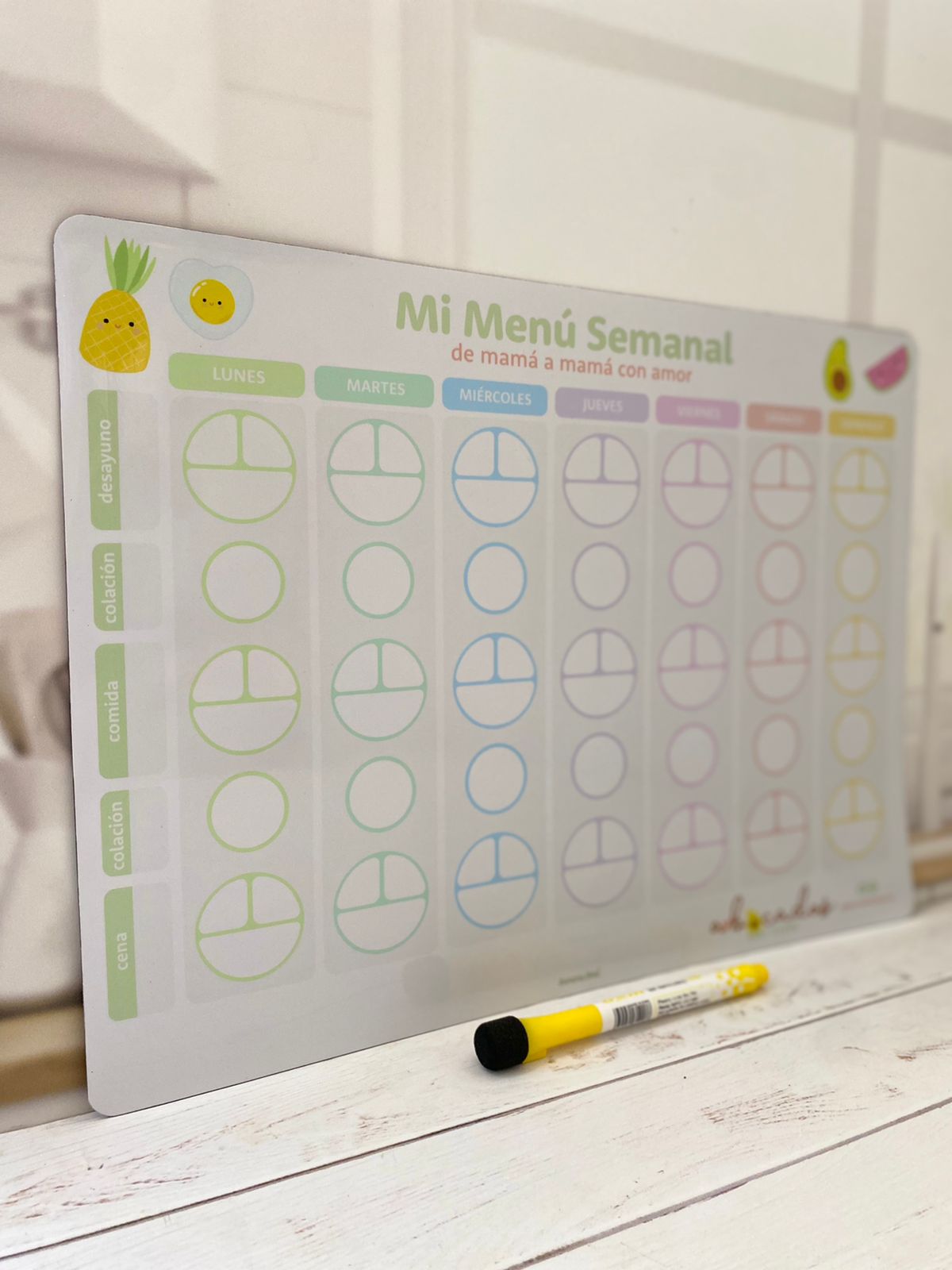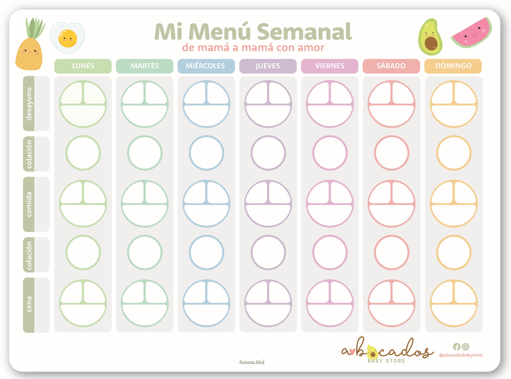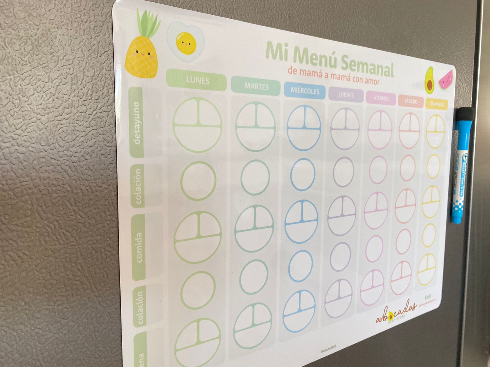 Planeador de menú semanal magnético para refrigerador. Ideal para colocar en el refrigerador y ayudarte a organizar las comidas de tu peque, considerando los 5 grupos de alimentos.