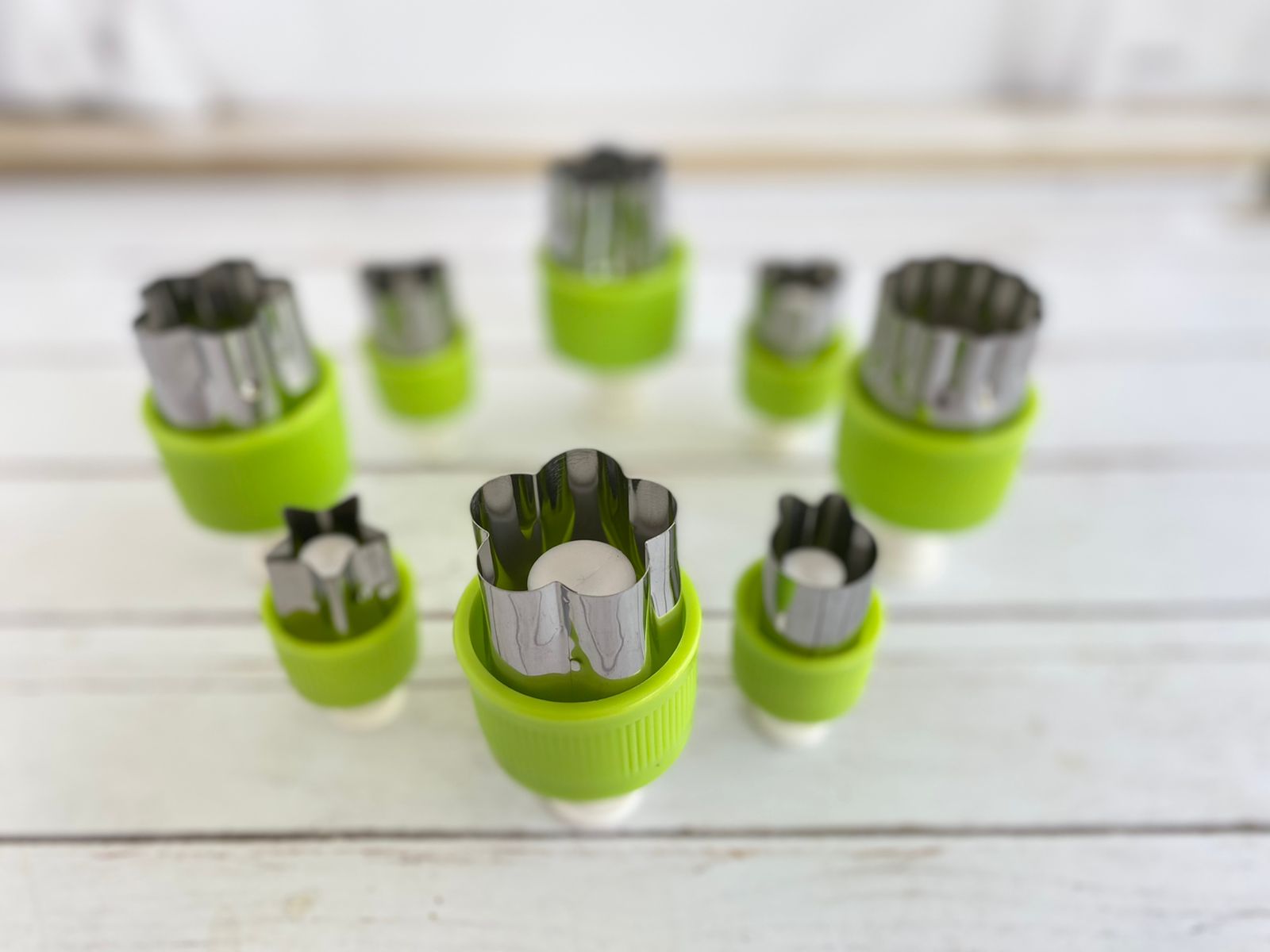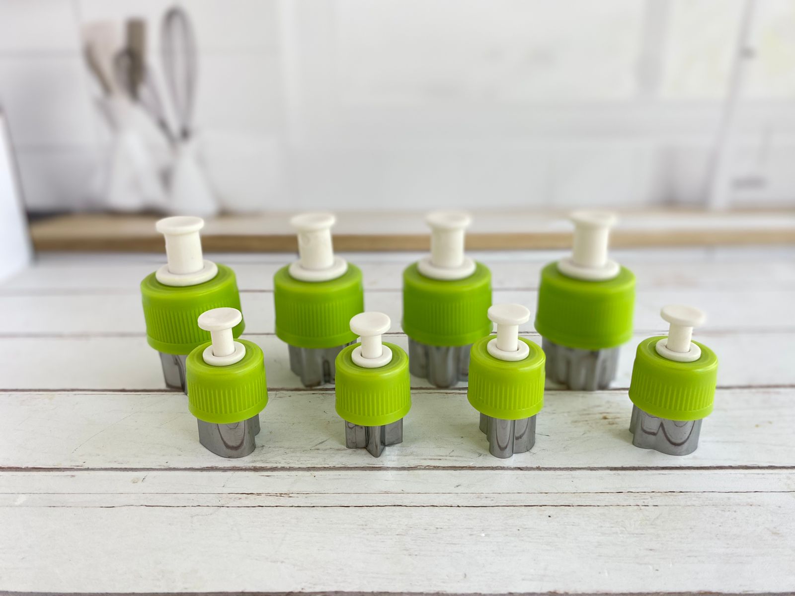 Set de 4 cortadores de fruta grandes y 4 pequeños de diferentes figuras, con botón para sacar los alimentos de una forma mas sencilla.