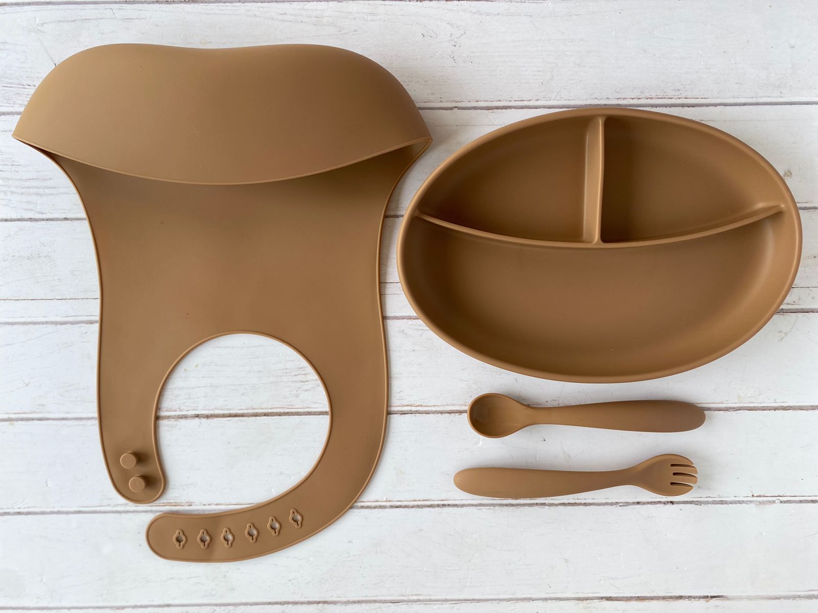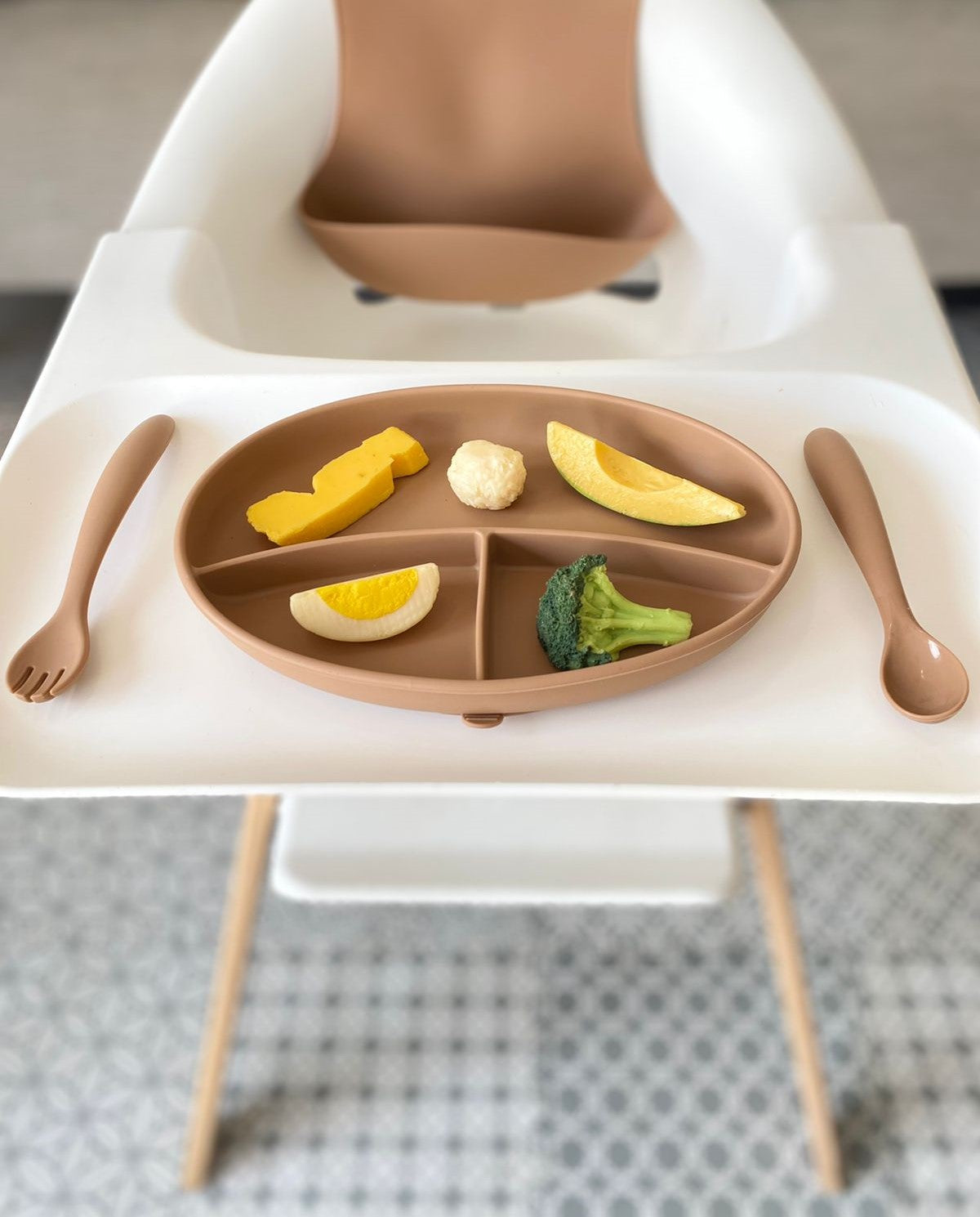 1 Plato plano con divisiones: Plato con ventosa para inmovilizar en la charola de la silla periquera o mesa del comedor, colores neutros para evitar que sea mas llamativo que los alimentos, divisiones que ayudan a recordar que tenemos que presentar platos variados y completos con los grupos de alimentos necesarios.