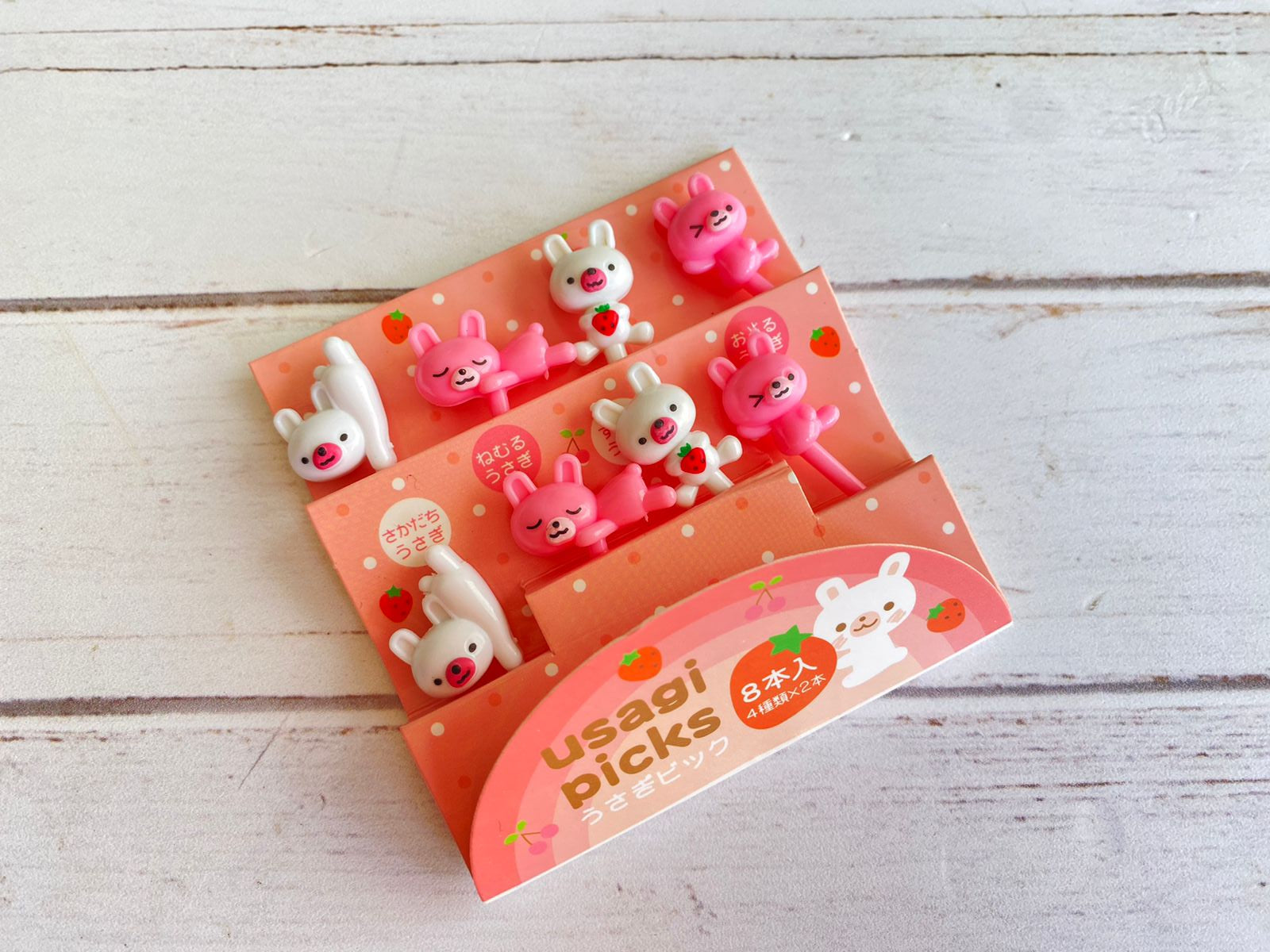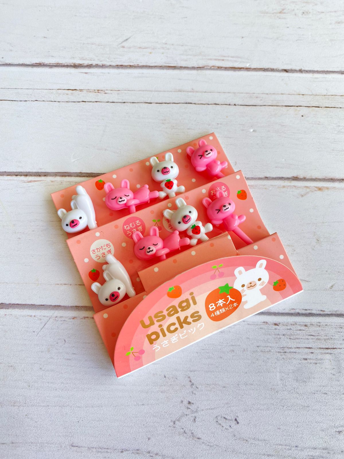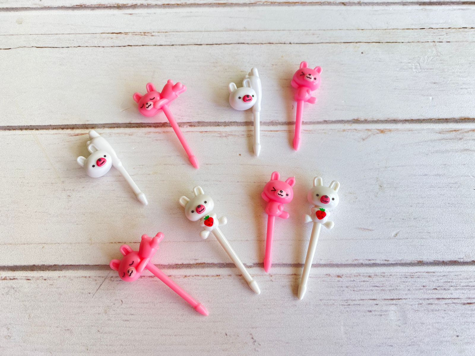Juego de 8 picks con formas de conejitos, ideales para adornar los platillos de los niños.