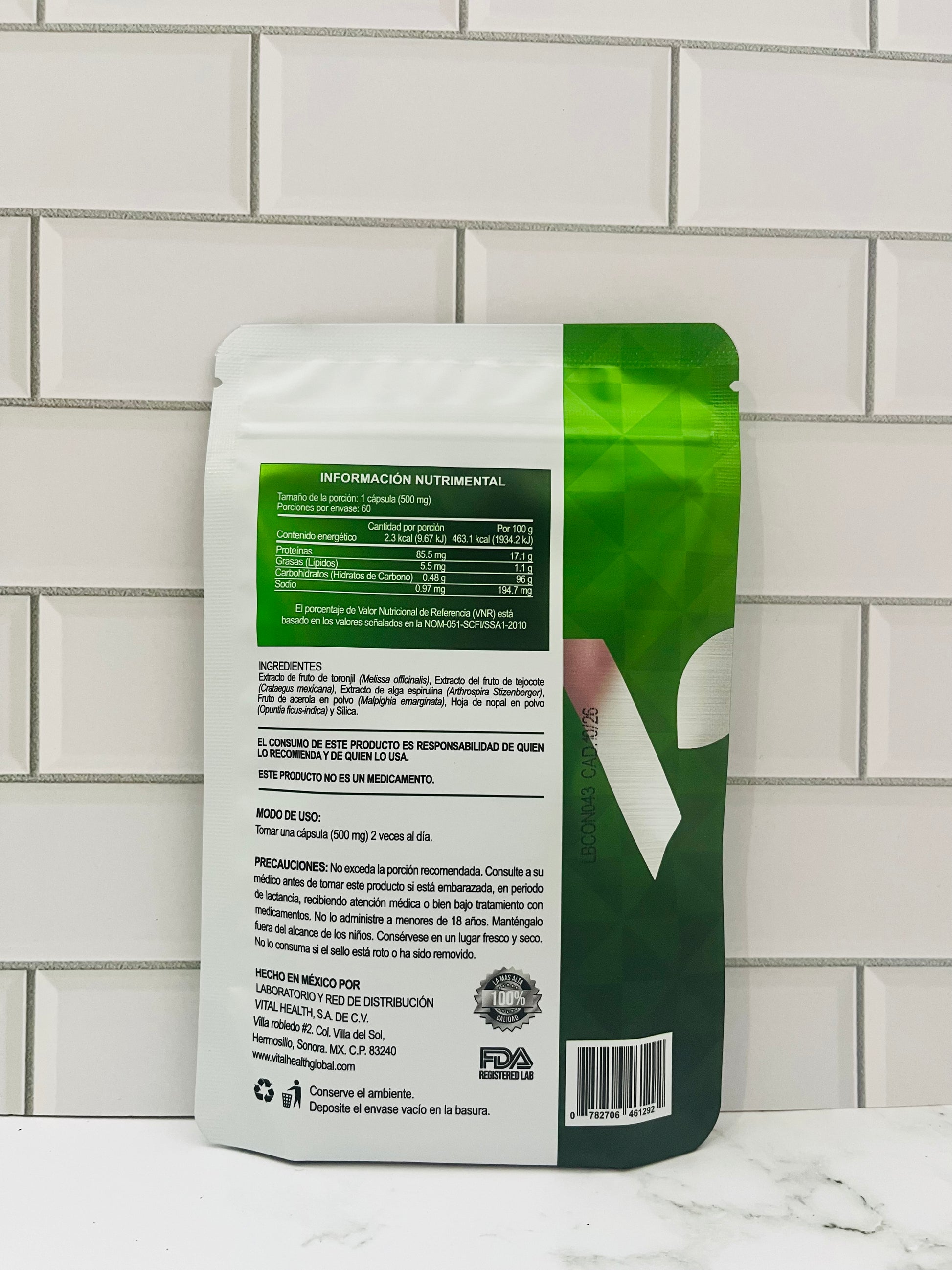 Fórmula a base de ingredientes naturales como el Alga Espirulina, Acerola, Toronjil, Tejocote y Nopal te pueden ayudar a sentirte saciado por más tiempo y a mantener niveles estables de azúcar en la sangre.
