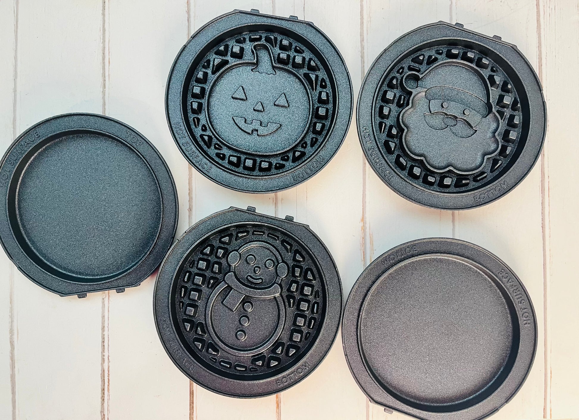 Viene con placas intercambiables que permiten crear waffles con divertidos motivos de Halloween, como calabazas y fantasmas, y de Navidad, como Santa y muñecos de nieve.